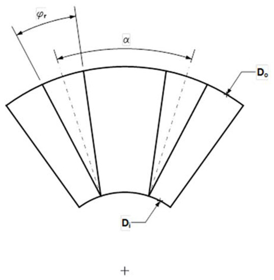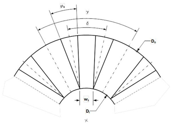 The polar pieces of the stator have a triangular shape and considering that in the stator pieces whose symmetry axis form an angle δ the inner sides of these pieces are parallel, that is, the distance ws is constant between Do and Di along the two stator poles, the angle φs is approximately: