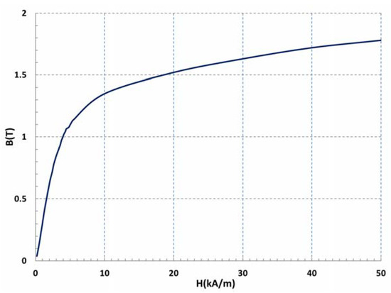 The construction of the magnetic circuit of the proposed AFSRM, due to the difficulties of built it with electrical steel, was made using SMC (Soft Magnetic Composites). First, commercially available Somaloy 700 3P was the selected material but finally a SMC material, with a density of 7.33 g/cm3 and with the B-H curve shown in Figure 10, was used.