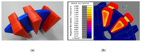 (a) Stator pole arrangement into the structural disk with parts made by 3 D printing and (b) map of magnetic flux density in the stator poles obtained by 3D-FEA when there is full alignment with the rotor poles for a current of 100 A.