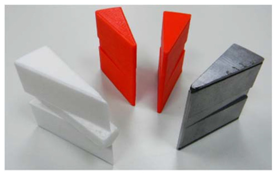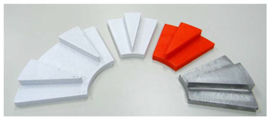 Figure 12 shows the evolution of the stator polar pieces from the first’s pieces obtained by 3D printing to the final of SMC. The evolution of the rotor pole pieces is also depicted in Figure 13. The final pieces of SMC both of stator and rotor are those that best respond, in shape and dimensions, to the conditioning factors of the materials, to the structural requirements, and to a minimization of its mass. Circumstances that modify some of the dimensions or parameters of the machine are indicated in the third column (final value) of Table A1 of the Appendix A.