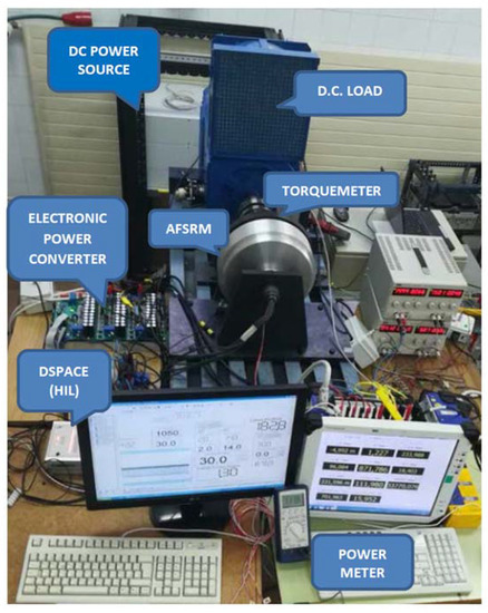 The AFSRM prototype was tested in the test rig shown in Figure 17. The AFSRM was coupled through a torque-meter, Kistler 4550A500S10N1KA0 500 Nm, to a DC machine acting as a brake and connected to a DC source variable in voltage and current, APS DPS 100–450, through the mentioned electronic power controller [20], controlled by a HIL platform, dSPACE ACE 1006. The measurements of torque, speed and power were monitored by means of testing power analyzer system, eDrive package GEN2tA-6ch-2Ms/s of HBM.