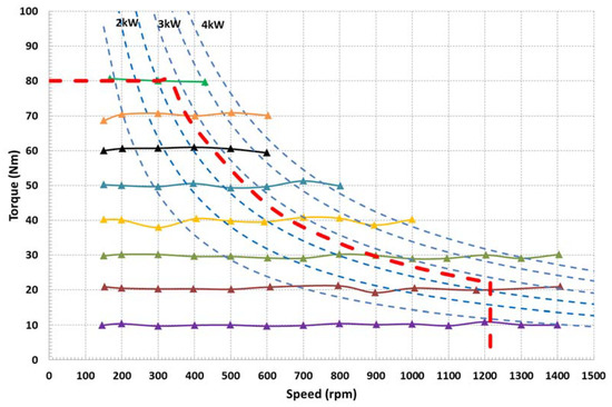 Torque-speed curves experimentally obtained on the test rig. Drive requirements depicted by the red dashed line.