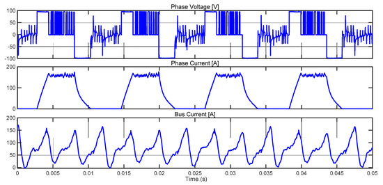 The test rig enabled the experimental determination of torque-speed curves of the AFSRM drive, keeping the speed constant while the load was increased acting on the DC machine. Figure 18 shows these curves, including power isolines for better comparison, with the drive expected requirements that are depicted by a dashed red line. The behavior of the drive at different points of operation was analyzed considering the aforementioned control strategy. Although turn-on and turn-off angles were predetermined by simulation, some adjustments had to be performed to adapt to the actual behavior of the drive. These adjustments were made to determine the angles that provided a lower absorbed current and a higher output torque, ensuring that the motor temperature was the same for all operating points. From these adjustments a new table of turn-on and turn-off angles was obtained that was better adapted to the different operating conditions of the AFSRM. Figure 19 shows the waveforms of phase current, phase voltage, and bus current for 500 rpm, 60 Nm with hysteresis control (θON = −4°, θOFF = 12°). Figure 20 depicts the waveforms of phase current, phase voltage and bus current for 900 rpm, 30 Nm with hysteresis control (θON = −7°, θOFF = 8°) and Figure 21 shows the waveforms of phase current, phase voltage, and bus current for 1400 rpm, 20 Nm with single pulse control (θON = −7°, θOFF = 8°).