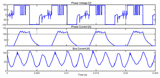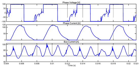 Experimental waveforms of phase current, phase voltage and bus current for 1400 rpm, 20 Nm with single pulse control θON = −7°, θOFF = 8°.