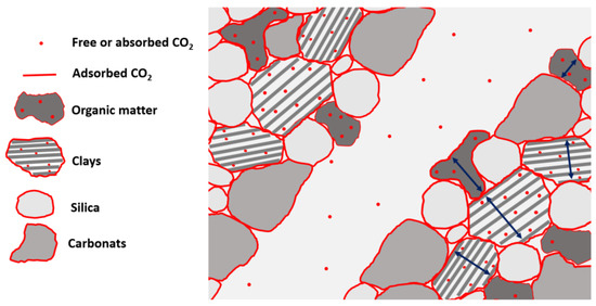 This phenomenon has been extensively studied both in the context of enhanced oil and gas recovery and in the context of CO2 sequestration [20,104,105,106,107,108,109,110]. Heller and Zoback [111] compared the sorption capacity of CO2 and that of methane on clay minerals (kaolinite and illite) and carbon as a model for shale components. The authors found that the sorption capacity of CO2 on both minerals and organic matter was 2–3 times higher compared to methane. According to Nuttall et al. [112] and Kang et al. [105], the difference in the sorption capacity between CO2 and methane can be up to 5–10 times depending on the shale type. Upon the adsorption and absorption of CO2, shales undergo volumetric changes [79,111], which are proportional to the amount of adsorbed CO2. For a given amount of adsorbed gas, the magnitude of swelling observed for different shales and shale components is different. The difference in swelling capacity has been attributed to the difference in the stiffness between materials (i.e., the stiffer the material was, the smaller the volume change that was found) [111]. The complexity of the swelling mechanisms of shales upon the adsorption of CO2 arises from the chemical diversity of shale components. Shale components can adsorb and absorb CO2 in both physical and chemical manners known as physi- and chemisorption. Figure 4 schematically illustrates the adsorption of CO2 at mineral grain surfaces, as well as its absorption inside organic matter and clay mineral grains under true dry conditions. The deformation of clay particles and organic matter upon the adsorption of CO2 is probably the main contributor to global shale volumetric changes when the shale is exposed to CO2 [111,113,114]. It has been shown that the spacing between the crystalline structure of clay sheets increases upon adsorption of CO2 [115]. For example, for a single hydrated Na-montmorillonite (with original spacing of d001~12.4 Å), the spacing increaed by 0.5 Å, which resulted in a 4% expansion in the direction perpendicular to the clay sheets [116]. The expansion determined for Na montmorillonite clays initially containing a higher fraction of water in the interlayer region has been reported to reach 9% [117]. The magnitude of this so called “crystalline swelling” is also dependent on the type of cation present in the interlayer [115]. Therefore, it is expected that the magnitude of clay swelling inside the shale matrix will be a result of CO2 adsorption and possible concomitant ion exchange processes.