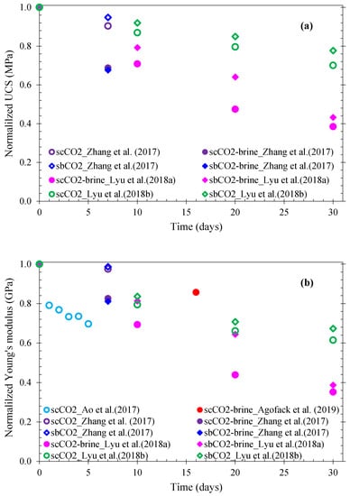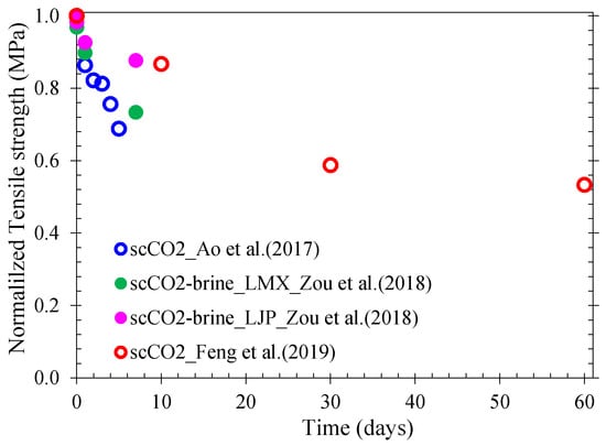 Feng et al. [24] exposed several samples of anisotropic shale from Sichuan in China to scCO2 for a time period of up to 60 days. After exposure and being returned to ambient conditions, samples with different bedding orientations were submitted to Brazilian testing. The results show a gradual decrease of tensile strength with exposure time, and little effect of bedding orientation was found. These results are similar to those found by other authors [171], as presented in Figure 6. The normalized values, also presented in previous figures, were obtained by dividing the value at a given age of exposure over the initial value (without CO2). The results of Ao et al. [171] demonstrate a reduction of around 30% for tensile strength after only 5 days of exposure, while the results of Feng et al. [24] show a reduction of around 8% and 45% after 10 and 60 days, respectively. The shale samples of these two investigations were from the same basin but with different total organic content (TOC). The reduction in tensile strength during the first week of exposure seems to be highly correlated with the TOC. In contrast, the results of Ojala [183] did not show any effect of CO2 on the tensile strength after exposure of Pierre shale to water and CO2-water for one week. Based on the surface energy theory presented in Equations (6) and (7), the results of Figure 6 seem to demonstrate that new cracks were formed within the shale specimens upon their exposure to CO2.