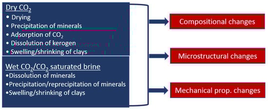 Since approximately 1950, the concentration of carbon dioxide (CO2) in the atmosphere has increased abnormally. It is widely believed that this increase is one of the main causes of current global warming [2,3,4]. One of the solutions to combat this increase is to capture anthropologically emitted CO2 and store it in suitable reservoirs. Among the CO2 capture and storage (CCS) alternatives, geological sequestration in high porosity reservoirs is currently the most mature technology to efficiently combat climate change. The feasibility of CCS has been demonstrated in many successful projects (e.g., Sleipner and Snøhvit in Norway and Decatur in the USA [5,6,7,8,9]). The injected CO2 is targeted to stay underground for a minimum period of 1000 years, with a leakage rate of less than 0.1% per year [10,11]. Suitable sites are permeable reservoirs sealed by a nearly impermeable geological layer known as caprock. The role of the caprock in CCS is to protect the stored CO2 from escaping back to the atmosphere [12]. An ideal caprock should, therefore, be a non-porous, non-fractured, non-permeable, and non-reactive layer that will stay intact for eternity, unperturbed by changes in the chemistry of the surrounding fluids, the stress-field associated with injection, or tectonic movements. However, in practice, shale rocks available as caprock, even with extremely low permeability, are sensitive to changes in temperature and the chemical environment and remain susceptible to failure under certain stress conditions [13]. When injected into a reservoir, CO2 first displaces the reservoir pore fluid (water or brine), some dissolves in the pore fluid, and the rest remains as dry CO2. Through buoyancy forces, the injected CO2 migrates upward and forms a plume underneath the caprock [14,15,16,17]. The caprock may thus come into contact with dry or wet CO2, as well as CO2-saturated brine. The CO2-rich fluids can migrate through fractures and faults and interact with shale via the different mechanisms described in Section 3.