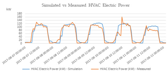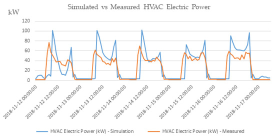 Following careful fine-tuning of the model, simulation results are improved as shown in Figure 6b. Specifically, parameters related to the infiltration, ventilation, internal loads (electric equipment and lighting), and occupancy of the various zones were varied until the best possible correlation was established. Although some noticeable at monthly level differences remain especially in April and May, overall, the simulated results approach actual measured values as revealed by CVRMSE of 14.33%. In Figure 7, simulated versus measured HVAC electric power for a week in November 2018 is presented. In this case, the simulated pattern follows the actual measured values; however, there clear deviations especially with respect to the peaks early in the morning and late in the afternoon are observed.