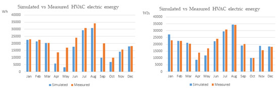 Measured total HVAC electrical energy consumption for the year 2018 versus: (a) initial model (baseline) (left plot) and (b) parameterized model (optimized) (right plot).