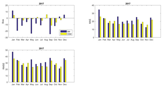 Statistical error indices for the energy prediction through the simulation model (SM) and the optimized simulation model (OSM) for the year 2017 (per month).