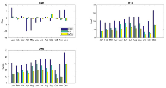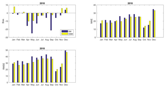 Figure 10 and Figure 11 illustrate the monthly Bias, MAE, and RMSE values for both reshaped models RS and w-RS computed for the intra-day performance of the models compared to the results obtained by the optimized simulation model (OSM). Both reshaped models perform better as all statistical indices in the majority of cases are significantly improved indicating the superior predictability of the reshaped approach.