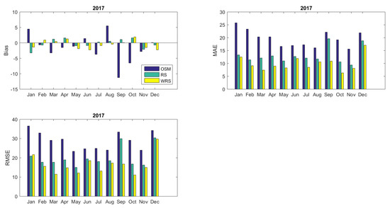 Statistical error indices for the Reshaped Simulation Model (RS) and the Weighted Reshaped Simulation Model (w-RS) for the year 2017 (per month).