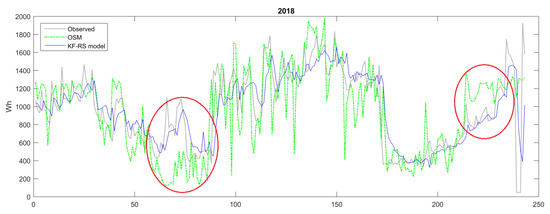 In Figure 12 and Figure 13, the performance of the KF-RS model in predicting the daily energy demand (summaries) is illustrated, comparing again to the OSM model. It is evident that the later model is significantly improved by correcting major inconsistencies in certain time periods throughout the year and more accurately approximating the true levels of energy needed. In particular, for special cases where systematic biases are present (see, e.g., highlighted periods in Figure 12 and Figure 13), the KF-RS model proves able to eliminate systematic over- or underestimations.