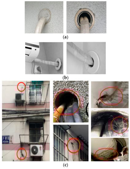 Air cavity through which air conditioner pipes pass: (a) a hole sealed with mud and the case after aging and shedding; (b) a hole through the wall of a newly built dwelling without sealing; (c) air conditioner pipe holes through the wall without sealing are very common in old buildings, and dust and mold accumulate.