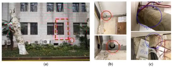 The monitored building and the monitored room: (a) The main facade of the monitored building and the monitored room (in red dashed line) with the air conditioner pipe hole, i.e., the air cavity (in red circle); (b) the air cavity in the monitored room without sealing; (c) mold colonization near the air cavity (in blue circle).