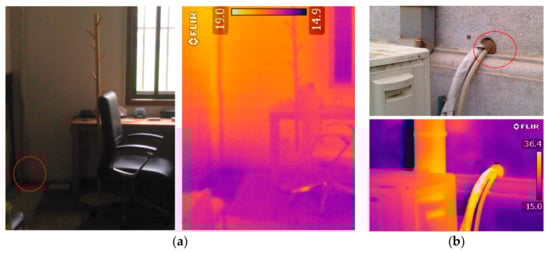 Infrared thermography of the air cavity area (in red circle) viewed from: (a) inside and (b) outside.