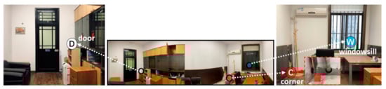 The monitored room (Figure 4) is on the first floor with a window to outside facing south, and it connects to the indoor corridor to the north. It has been used as an office for years. The severe moldy smell and dampness were experienced during hot and rainy days.