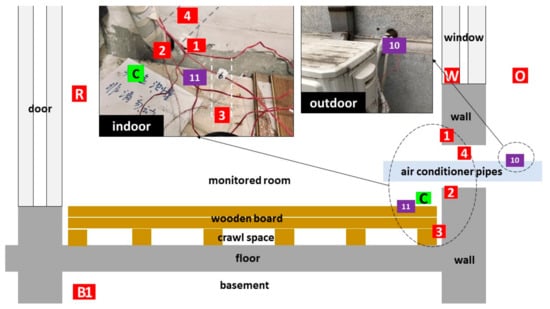 The walls were originally blue bricks (240 mm thickness) with concrete and cement mortar surfaces. In the 1980s, the foundation was strengthened and waterproofed, while the terrazzo floor layer was changed into timber-framework floor. Although the interior walls have been repainted by cement mortar, the exterior wall remains untreated to maintain the historical facade. However, these porous building materials are especially vulnerable to rising damp, wind-driven rain and interstitial condensation. Things became even worse when the air conditioner pipe holes penetrated the wall, promoting air leakage through the air cavity. Figure 2b,c shows the air cavity in the corner. It is not carefully sealed, and severe mold colonization can be found on the surface of pipes nearby.
