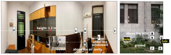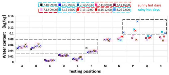 The surface water content of the wall surface was measured on several days in the summer of 2019. Figure 6 shows the testing positions. As shown in Figure 17, compared with inner wall surfaces (C/D/E), the outer wall surfaces (A/B/F) had higher water content, especially the wall surface near the air cavity (A). The wall near door (D) and the wall near the window (A/B/F) had higher water content, so the main route for moisture transfer might be moisture adsorption to the low-temperature wall. The moisture content of the external wall surface (M/N/P/Q/R) was much higher. On rainy days, the parts near the ground and the air cavity had more water.