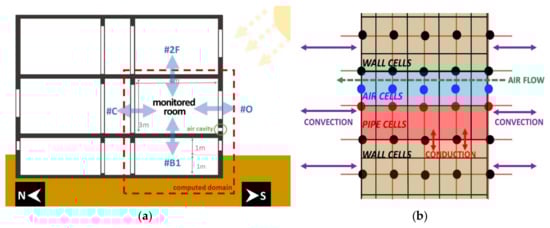 Simplified from the main section of the monitored room, a two-dimensional hygrothermal simulation model was made, as shown in Figure 7a. The size of the room was 4 m in depth and 3 m in height, with a door (2 m) and a window (1 m), and the thickness of floors and walls was 200 mm. The characteristics of the typical brick in South China were used as the material properties [] for the walls and floors in the simulation. As Figure 7b shows, pipe cells (located at x = 10.2–10.4 m, y = 16.25–16.30 m) that make contact with the lower surface of the air cavity and air cells (located at x = 10.2–10.4 m, y = 16.30–16.35 m) are set in the air cavity area. Heat conduction occurs between the pipe cells and lower cavity surface, while convective transfer between the upper surface of the cavity and air flow happens through air cells. Pipe cells were given smaller heat capacities and larger thermal resistance values compared with wall cells, and they are assumed as impermeable to moisture.