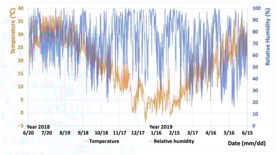 Temperature and relative humidity of Nanjing from June 2018 to June 2019, (source: weather station in Southeast University, Nanjing, China).