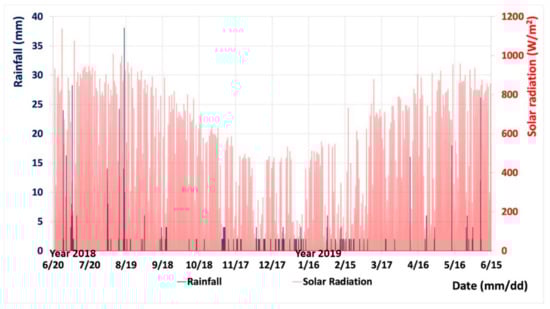 Solar radiation and rainfall of Nanjing from June 2018 to June 2019, (source: weather station in Southeast University, Nanjing, China).