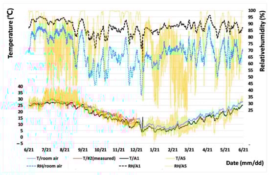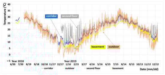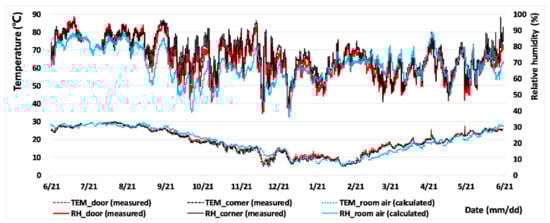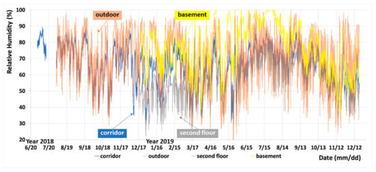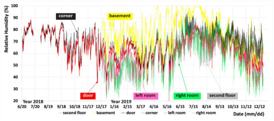 Figure 13 shows that throughout the year, the monitored room was surrounded by a humid environment, that is, the outdoors and the basement. The relative humidity values of the basement and the outdoors were almost 80–90% in the night time of early summer (late June–July) and early winter (early November–December). The relative humidity near the door was also kept at high level (70–90%) from July to September, slightly lower than that of the corner.