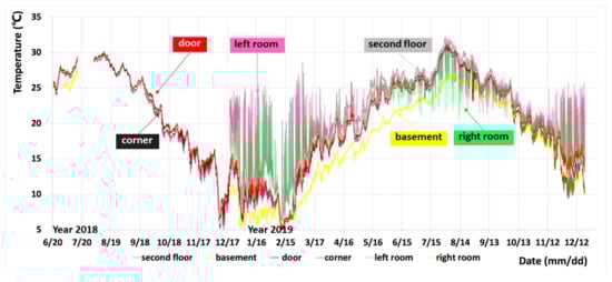 As shown in Figure 12, the air temperature near the door showed an annual change from 5 °C to 31 °C. It is lower than the outdoor temperature by approximately 5 °C and higher than that of the corner by 0.5–1 °C during daytime in summer.