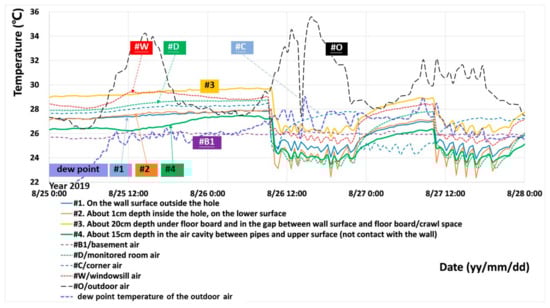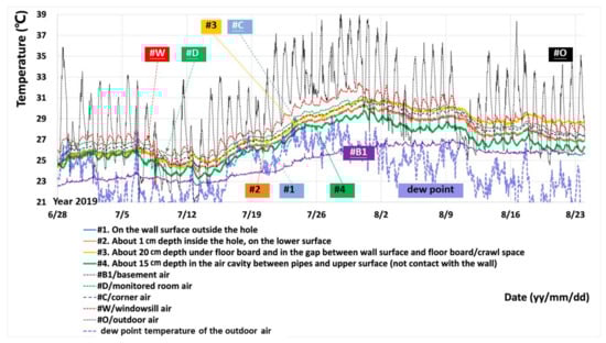 Figure 14 shows the temperatures around the air cavity in the summer of 2019. The air temperature near the windowsill had a similar diurnal change with the outdoor temperature. The corner air temperature changed in parallel with that of the air in the gap between wall surface and floor board/crawl space (#3). No difference appeared between the temperatures of the wall surface (#1) and the hole surface 1 cm deep (#2). Among these temperatures, the basement and the cavity air 15 cm deep (#4) had the lowest values. The surface temperature near the air cavity (#1, #2 and #4) was lower than the dew-point temperature of outdoor air occasionally (28 and 29 June; 17, 18 and 23 July), which might have caused condensation.