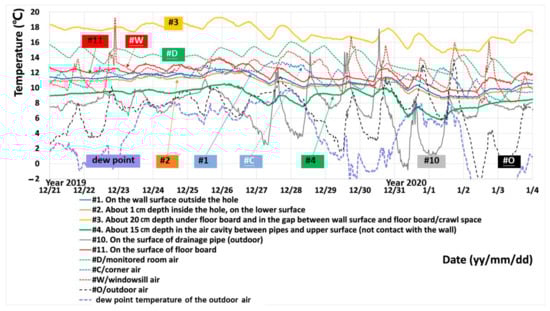 Figure 16 shows the temperatures around the air cavity in the winter of 2019/2020. The temperature of the floorboard (#11) was higher than those of the wall surface (#1) and the hole surface (#2). It might have been influenced by the crawl space made of wooden framework, in which heat was generated by electricity wires. Except for the outer part of the air cavity (#4), there seemed no risk of condensation.