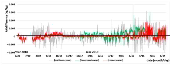 Figure 18 shows the potential moisture sources. There are three periods that the absolute humidity of the monitored room (at the door) was lower than that of the outdoors/basement. From late May to early July, absolute humidity of the basement stayed higher than that of the room (at the door), while the outdoor humidity stayed higher from early June to early July and from late July to early August. The rainy season (early June–July) is indeed the risky period. Apart from wind-driven rain and rising damp, the air leakage through the air cavity provided a crucial route for moisture input.
