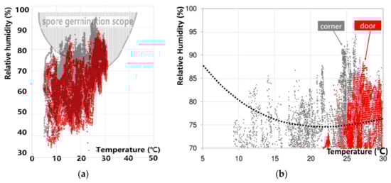 Figure 19a shows the mold growth risk based on the air temperature and relative humidity at the door and the corner, according to Klaus Sedlbauer’s fungal spores’ germination scope evaluation. The risk at the corner was marginally higher than that at the door. Based on the ESP-r model [], when the relative humidity and temperature combination exceeds the curve, mold growth of the matching fungi will occur. Aspergillus penicilliodes, the commonest species in building environments, can be suitable as a crucial sensor fungus for indoor environments []. As shown in Figure 19b, nearly half of the figures of the air at the door and the corner, from June to September, surpass the curve of this “highly xerophilic” fungi. The corner has a rather severe scenario.