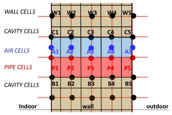 In this research, we developed a Fortran simulation code based on Matsumoto’s hygrothermal transient and simultaneous transfer equations (Equations (1)–(7)) []. The finite difference method (central difference) and time forward scheme [] were adopted. In the heat and moisture balance of the air in the cavity, the upwind scheme was used for stability.