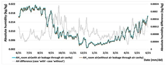 As shown in Figure 22, air leakage through the air cavity increased the indoor absolute humidity. From June to August, the absolute humidity of the room was at a high level, regardless of whether there was air flow through the air cavity. In the following drier months (October–December), the effect of air leakage seemed to be greater, bringing more moisture to the indoors.