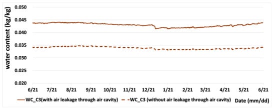 Calculated water content of the upper cavity cells (C3) in the cases with/without air leakage through air cavity.
