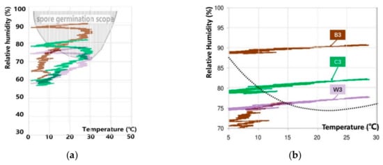 Mold growth risk evaluation of the indoor air at the door and the corner: (a) fungal spores’ germination scope (all the months); (b) Aspergillus penicilliodes’ growth risk evaluation during summer (June–September).