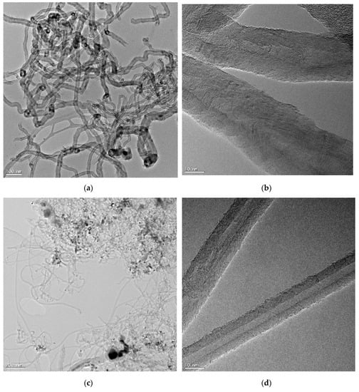 CNTs were produced by the decomposition of a methane-rich stream (H2 = 10 L/h; CH4 = 48 L/h; N2 = 38 L/h) in a rotatory bed reactor, as elsewhere described [39]. Fe-Mo/MgO (7.5:1.5:91.0 molar %) prepared by co-precipitation was used as a catalyst at 900 °C and for 30 min. The synthesis of these catalysts and the procedures of CNT growth are described elsewhere [40,41]. Additionally, CNTs were purified and oxidised as previously described for CNF.
