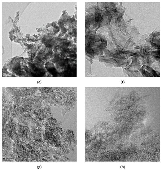 The morphological appearance of the supports was observed by TEM, as shown in Figure 1. CNF showed a graphite stacking in the form of a fishbone-type nanofilament, with an inner hollow core of around 6 nm in diameter and an average outer diameter of 20–30 nm (Figure 1a,b). CNT showed narrower diameters (10–15 nm) with a regular stacking of 8–20 concentric layers (Figure 1c–d). RGO was composed by agglomerates of wrinkled sheets of 4–6 layers (Figure 1e–f). The commercial AC consisted of spherical aggregates composed of randomly aligned small graphite crystallites (Figure 1g–h).