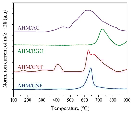 In order to determine the optimal CHR temperature, the carburization of AHM/NCM samples was carried out in a thermobalance coupled with MS (TG-MS). As previously reported [18], the evolution of m/z = 28 during the CHR stage allowed us to select the temperature necessary to carry out the carburization process. This m/z value is related to the CO formed during the carburization of MoO2 to Mo2C. Figure 2 shows this evolution with temperature. The appearance of a CO signal started at different temperatures depending on the support used in the AHM carboreduction. Thus, an m/z = 28 signal appeared at around 500 °C for AHM/AC, at around 560 °C for carbon nanofilaments (CNF and CNT) and at around 630 °C for RGO. An m/z = 28 signal reached a maximum at temperatures centred around 625–645 °C, except for RGO, for which the MoO2 carburization (and CO formation) was hindered and shifted up to around 725 °C. These differences may be tentatively attributed to the physicochemical properties. Thus, the lower oxygen content in the support resulted in lower CO onset temperature. This factor may influence the dispersion and interaction between the Mo precursor and the support, thus affecting the CO evolution during carbide formation.