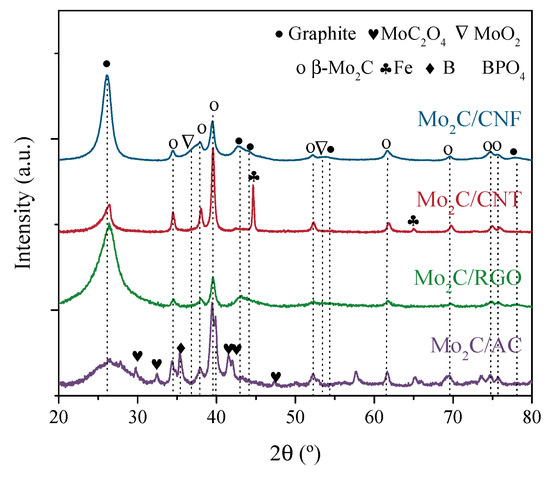 SBET and Vt of the Mo2C/NCM catalysts were measured by N2 physisorption, and the results are listed in Table 2. As a general rule, the catalysts showed smaller SBET and Vt values than their respective supports, motivated by the partial covering of the pores by the Mo phase (Table 1), except for the Mo2C/GO catalyst which had a slight increase in the porosity values due to the formation of meso and micropores upon the removal of the oxygen and sulphur surface groups, as evidenced in Figure S3 in the Supplementary Information. The AC-based catalyst had a much more pronounced SBET and Vt reduction, attributed to a partial destruction of its micro and mesoporosity (see Figure S3 in the Supplementary Information).