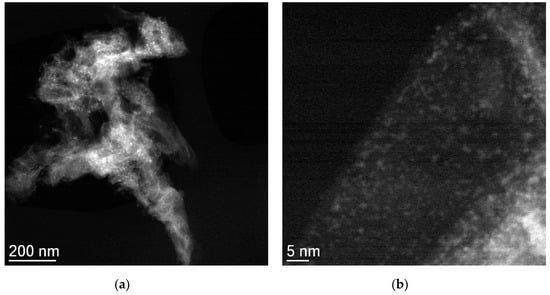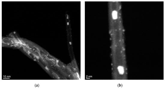 The morphology of all catalysts was observed by STEM. Likewise, the composition of bright particles was determined by EDX (see Figures S4–S6 in the Supplementary Information). Particle size was calculated by measuring the diameter of isolated metallic bright particles from TEM images. In order to do so, more than 250 particles were considered in the analysis. Mo2C/CNF (Figure 5) showed a β-Mo2C particle size distribution around 4.9 ± 2.1 nm along with the nanofiber structure. The particle sizes of these nanoparticles shown by the HAADF images are different from those calculated by XRD (10.9 nm). On the other hand, a homogeneous dispersion of nanoparticles lower than 2 nm was observed covering the CNF (Figure 5b). However, these nanoparticles were under the detection limit of EDX and XRD techniques due to their small size. In the case of Mo2C/CNT (Figure 6), the STEM micrographs revealed some differences in the morphology and composition of particles in the sample. Figure 6a shows a representative image of this material, showing some areas of metal accumulation probably motivated by a heterogeneous impregnation of the precursor (white rectangle). These areas coexisted with the presence of long CNTs decorated with β-Mo2C particles of different sizes both in the inner and in the outer surface (white circles) and iron particles from the catalyst employed on the support growth embedded in the inner core (white arrows), as determined by EDX (see Figure S4 in the Supplementary Information). In the case of Mo2C/RGO (Figure 7), this catalyst showed a high concentration of well-dispersed small metallic nanoparticles (2–4 nm). Besides, the chemical composition of bright particles was related exclusively to Mo species as shown in Figure S5 (see Supplementary Information). Similarly, Mo2C/AC showed a high metal concentration covering the support (Figure 8). According to the performed EDX (see Figure S6 in the Supplementary Information), the support was comprised of Mo, C and P, with the bright round nanoparticles being the dispersed Mo2C.