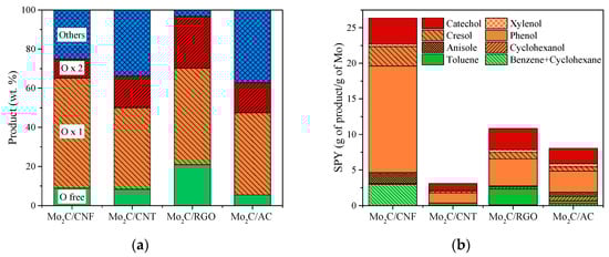 Catalytic results obtained in the HDO of guaiacol using different NCMs as a support of Mo2C: (a) product distribution grouped by oxygen content; (b) product production per gram of Mo (SPY).
