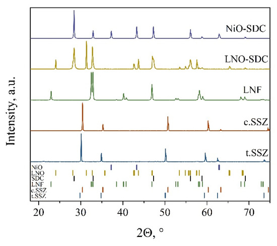 - Kurteeva, A.A.; Beresnev, S.M.; Osinkin, D.A.; Kuzin, B.L.; Vdovin, G.K.; Zhuravlev, V.D.; Bogdanovich, N.M.; Bronin, D.I.; Pankratov, A.A.; Yaroslavtsev, I.Y. Single solid–oxide fuel cells with supporting Ni-cermet anode. Rus. J. Electrochem. 2011, 47, 1381–1388. [Google Scholar] [CrossRef]