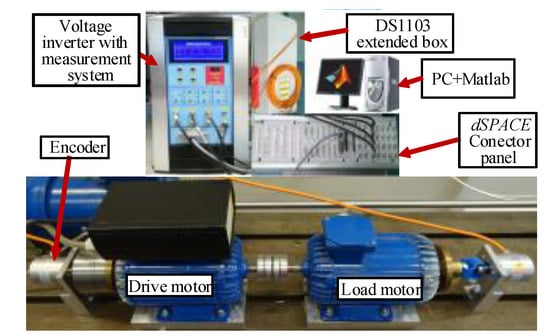The following section is devoted to the presentation of the experimental results related to both control structures. Figure 2 depicts the block diagram of the experimental set-up, including an induction motor of nominal power 1.1 kW driven by a power converter. The motor and the load machine were connected with a shaft. Incremental encoders of 36,000 pulses provided measurement of the speed and position of the drive. A digital signal processor using the dSPACE 1103 calculated the control algorithms. The sampling time of the predictive controller was set to 0.2 ms. A simulation current model was utilized to estimate the rotor flux [].