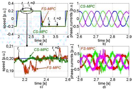 The application of the two MPC approaches (FS- and CS-MPC) to the speed and torque control of an IM drive is presented in []. The authors have proposed a cascade system, in which two major loops are evident, i.e., torque and speed. The speed MPC based loop generates a control signal for the torque loop. In both loops a different cost function is specified. The investigated control strategies are implemented and tested with the help of an experimental ring with a 3.7 kW IM. The general conclusion formulated in the paper is that both strategies ensure similar dynamic performances, yet the CS- possess a smaller torque ripple. In [] comparative studies discussing the application of FS- and CS-MPC to a power converter and PMSM are presented. The system performances in terms of current ripple and switching frequency are evaluated. Both systems are characterized by similar dynamic responses, although the CS-MPC is preferred.