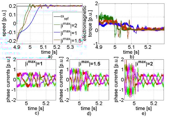 In Figure 4 transients of the speeds (a), driving torque (b), and stator current (c,d,e) for different values of the stator limitation (abs(imax) = 1, 1.5 and 2) are presented. As can be concluded from Figure 4, the system worked correctly. Depending on the assumed signal limits, different torque levels and speed rising times were obtained. Despite correct work of the control structure, some oscillations were evident into torque transients. Those oscillations caused the shape of the speed transients during the raising time, which are not straight. The current possessed high frequency noises, which are characteristic for FS-MPC.