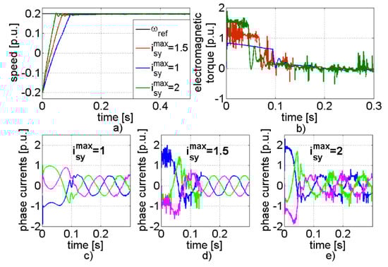 Selected transients of the CS-MPC: speed (a), driving torque (b), and currents (c,d,e) for different value of the stator current limitation: isy = 1, 1.5, and 2 and value of the reference signal ωref = 0.2.