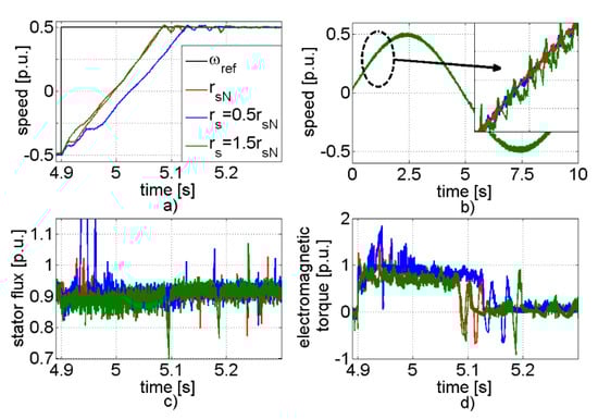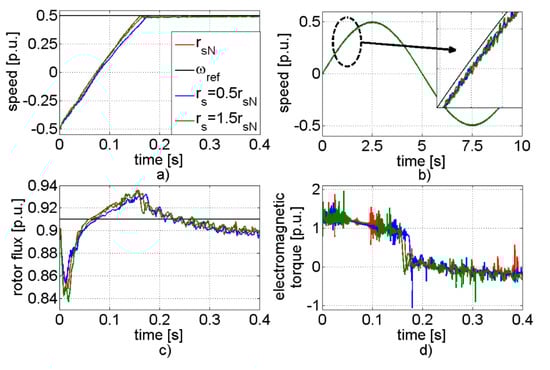In Figure 6, the speed, stator flux, and torque transients for different values of the stator resistance are presented. The reference value of the speed was set to the half of the nominal one. The system was working under reverse conditions. It should be noted that in this case the shape of the speed during start-up was straighter than for smaller value of the reference signal. The decrease of the value of the stator resistance influenced the system properties significantly. The settling time of the speed was bigger than for the other cases. Additionally, oscillations of the speed during transients were bigger (Figure 6b). The increase of the stator resistance value had a small effect on the system speed. The settling time of the speed was almost identical as for the nominal parameters. The stator flux was controlled correctly.