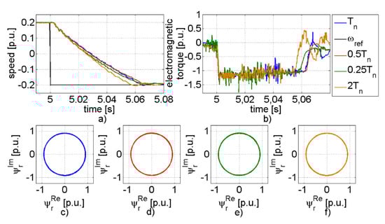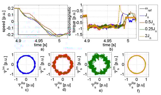 Then, the effect of the changing of the inertia was analyzed using transients presented in Figure 7. The following cases were considered: inertia equal to nominal value (J = Jn), decrease (J = 0.5Jn and J = 0.25Jn), and increase (J = 2Jn) of the inertia. The analyzed system worked under a reverse condition; the reference speed changed from 0.2 to −0.2. The transient of the speed, torque, and flux for the nominal system parameter is presented with the blue line. The increase of the inertia had a relatively small effect on the transients of the system. The shapes of the system variables were similar to the system with nominal parameters. Contrary to this, the decrease of the inertia can be seen more clearly in the transients. The settling time of the speed increased, and the hodograph of the flux was noisier.