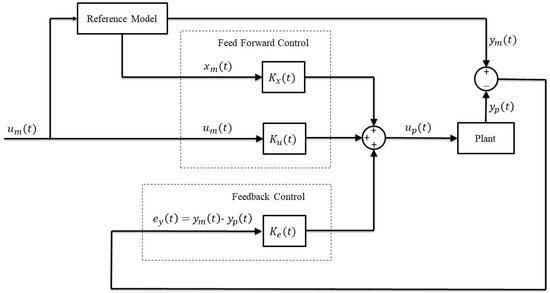 The reference model must have the same number of outputs as the plant. The adaptive control signal composed of the error in the feedback, the model states, and the model input in the feed-forward, as shown in